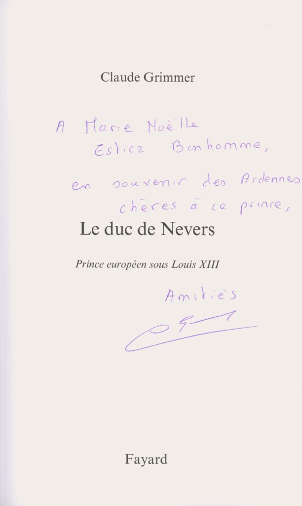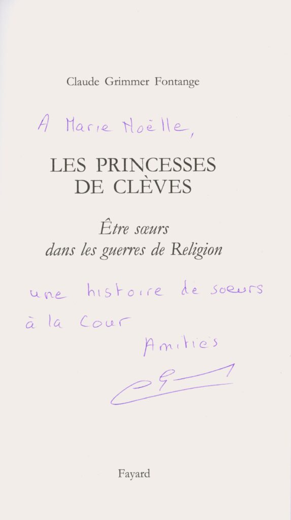 Marie-Noëlle ESTIEZ BONHOMME a notamment échangé avec Claude Grimmer Fontange, qui lui a dédicacé ses deux ouvrages Les Princesses de Clèves : être sœurs dans les guerres de religion (Fayard) et Le duc de Nevers européen sous Louis XIII (Fayard).