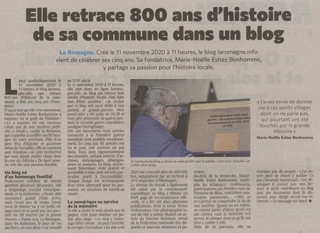 📰 Mercredi 19 novembre 2025 – La Romagne à l’honneur dans L’Union (édition des Ardennes) : cinq ans d’histoire partagés grâce au blog laromagne.info