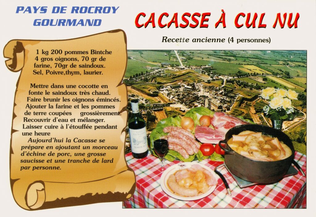 La cacasse à cul nu est un plat traditionnel des Ardennes, composé de pommes de terre mijotées avec des oignons, du lard et des aromates, typique d’une cuisine simple et roborative.
