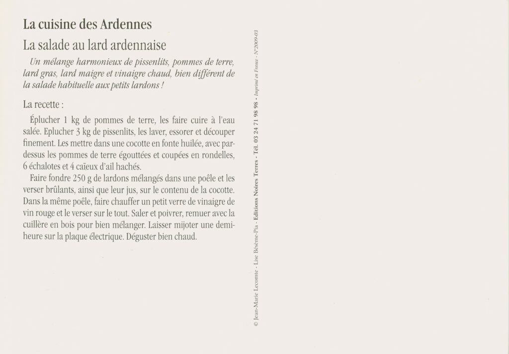 L’hiver est aussi l’occasion de découvrir et de savourer les traditions culinaires ardennaises, à la maison ou au restaurant entre amis. La « cacasse à cul nu », fricassée de pommes de terre autrefois servie sans viande, et la salade au lard, préparée avec pommes de terre, pissenlits et lard fermier, réchauffent après une promenade dans le froid.