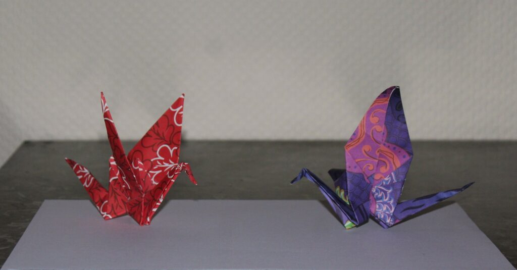 Ce geste, symbole de paix et d’espoir, rend hommage à Sadako Sasaki, jeune victime d’Hiroshima.