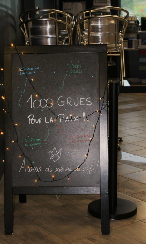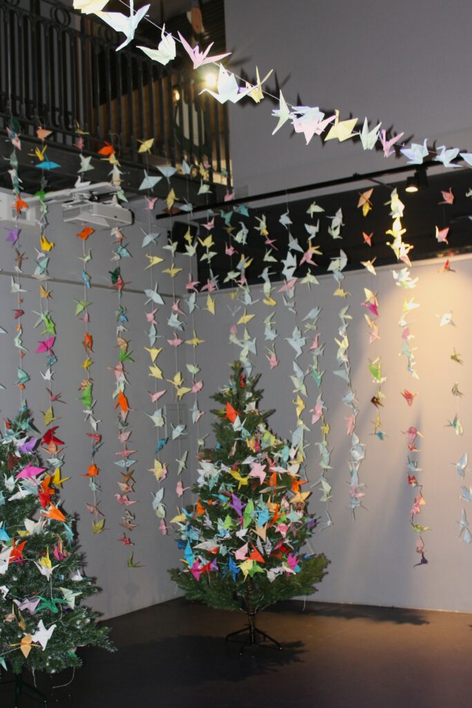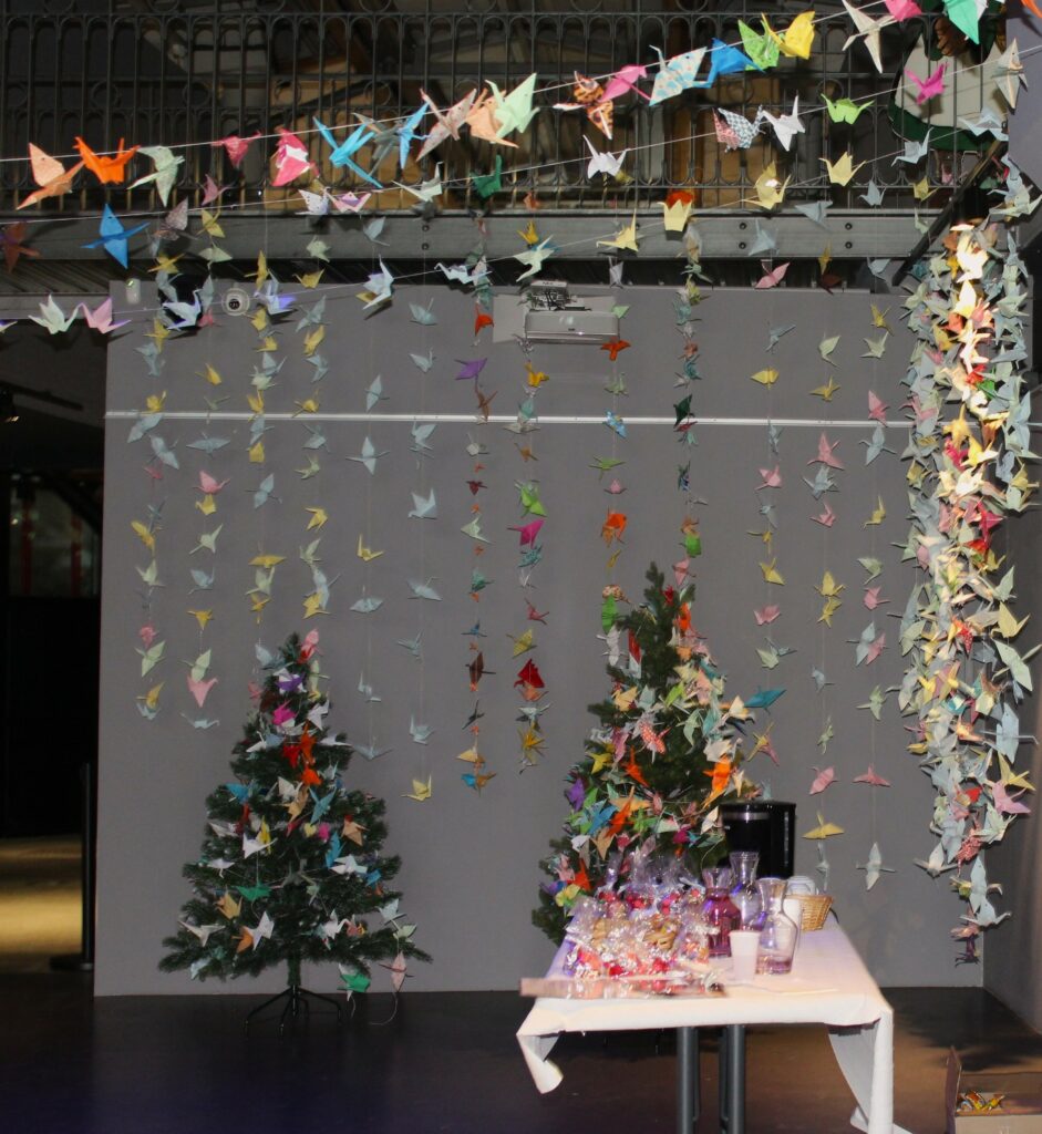 Depuis janvier 2025, visiteurs, écoles, associations et le blog laromagne.info réalisent leurs propres origamis, exposés dans l’atrium du musée sous forme d’une guirlande de la paix.
