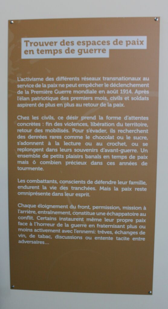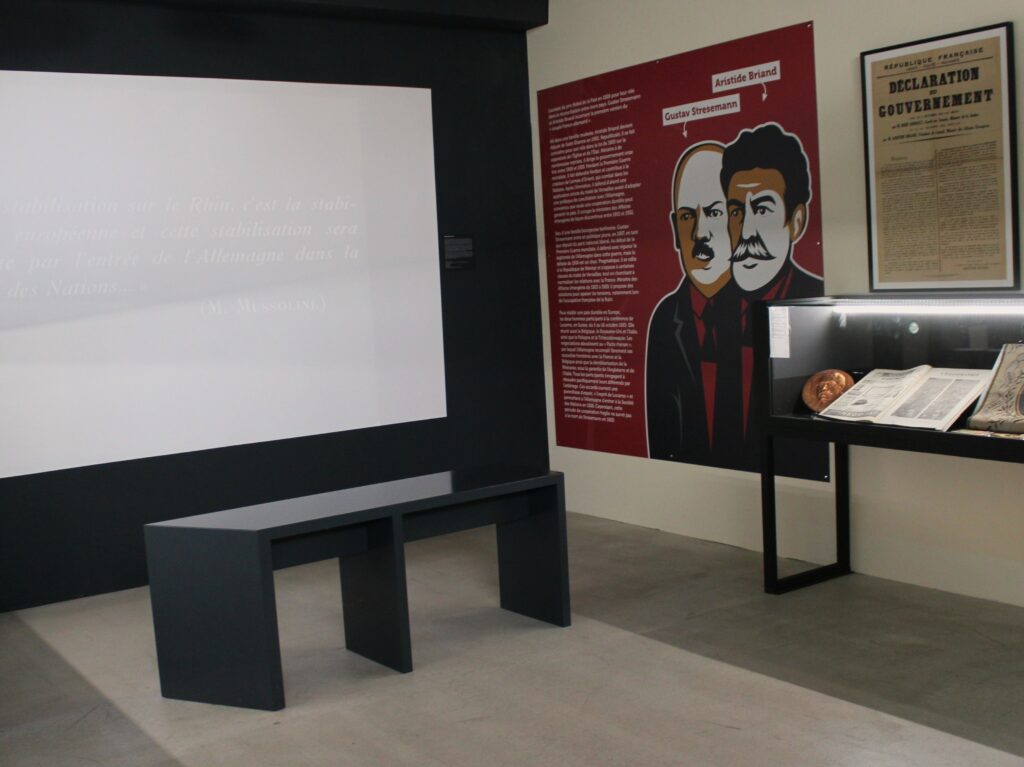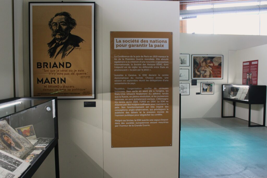 L’exposition présente le pacifisme comme un engagement pour le dialogue, la réconciliation et la coopération entre nations, dans le contexte historique des efforts pour une paix durable en Europe.